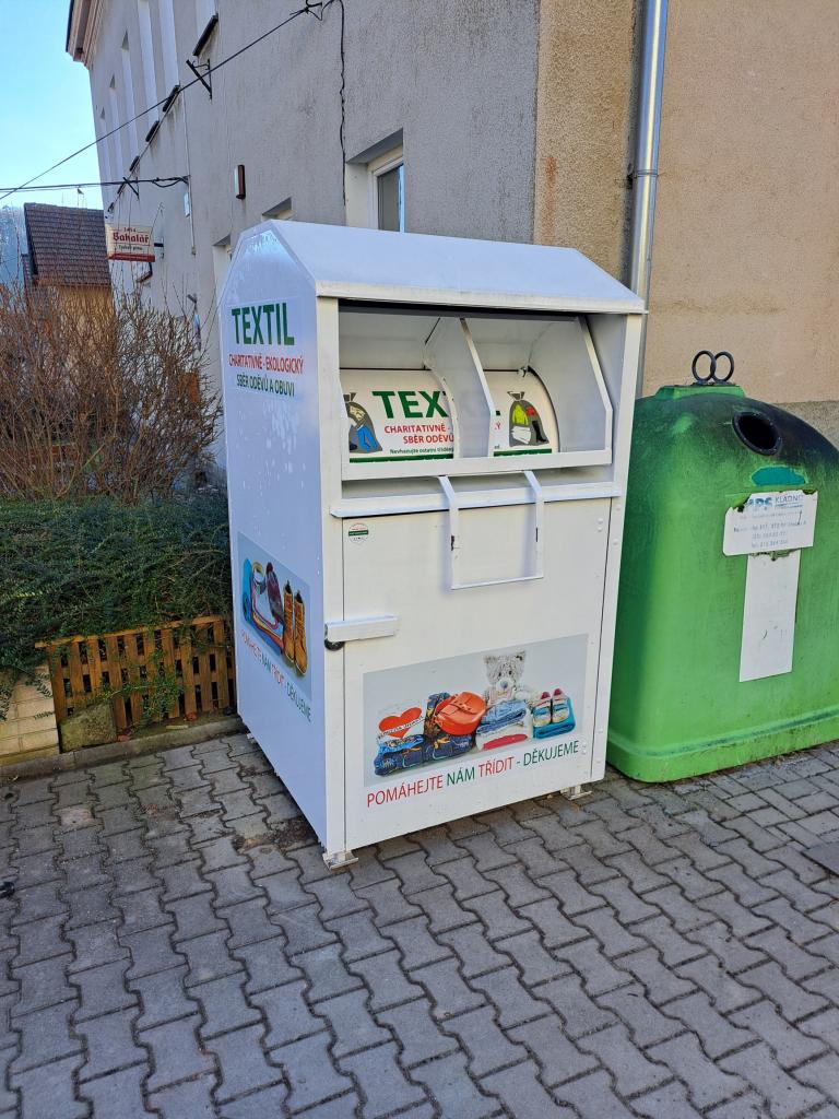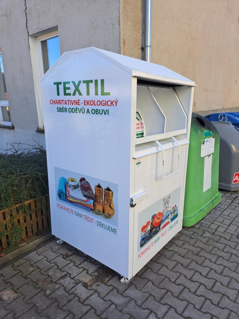 Nový kontejner na sběr starého textilu byl umístěn vedle budovy obecního úřadu, sběr zajišťuje společnost DIMATEX CS.
