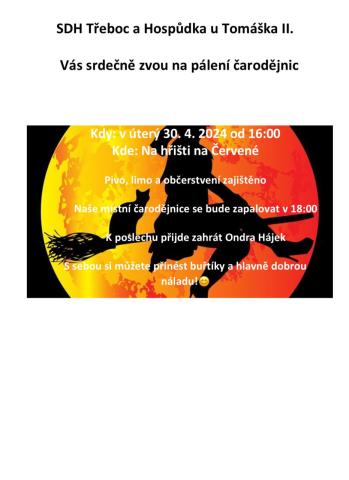 SDH Třeboc a Hospůdka u Tomáška II. Vás srdečně zvou na pálení čarodějnic v Třeboci