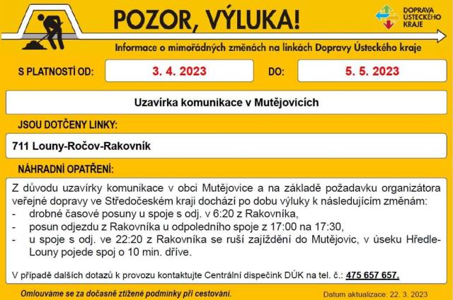 - u spoje s odj. ve 22:20 z Rakovníka se ruší zajíždění do Mutějovic, v úseku Hředle Louny pojede spoj o 10 min. dříve.