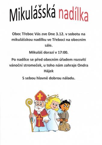 Obec Třeboc Vás srdečně zve dne 3.12.2022 na mikulášskou nadílku v Třeboci, Mikuláš s čertem dorazí v 17:00 hodin, po nadílce se rozsvítí vánoční stromeček a zahraje Ondra Hájek.