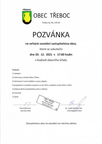 Pozvánka na veřejné zasedání zastupitelstva obce 20.12.2021