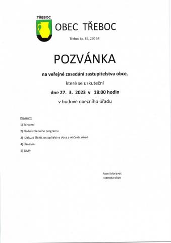 Pozvánka na veřejné zasedání zastupitelstva obce dne 27.3.2023
