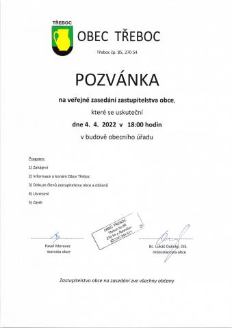 Pozvánka na veřejné zasedání zastupitelstva obce dne 4.4.2022