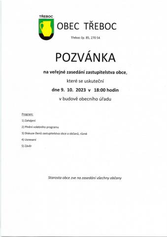 Pozvánka na veřejné zasedání zastupitelstva obce dne 9. 10. 2023