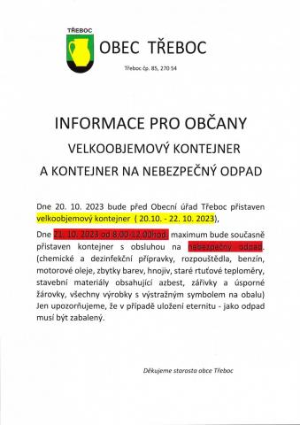 Dne 20. 10. 2023 bude před Obecní úřad Třeboc přistaven velkoobjemový kontejner ( 20.10. - 22. 10. 2023),