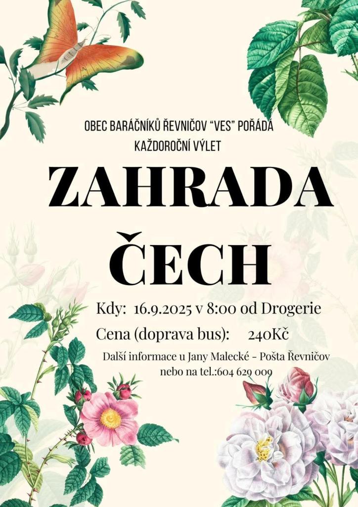 Obec baráčníků Řevničov "Ves" pořádá každoroční výlet na Zahradu Čech dne 16.9.2025, odjezd 08:00 hod od drogerie, více u paní Malecké na poště.