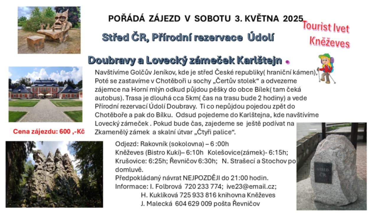 Zájezd 3.5.2025 Střed ČR, Přírodní rezervace Údolí Doubravy a Lovecký zámeček Karlštejn.