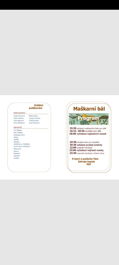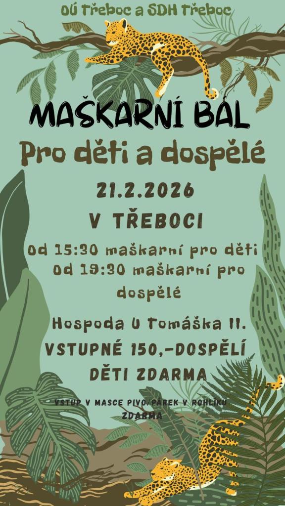 OÚ Třeboc a SDH Třeboc uspořádalo Maškarní bál pro děti a dospělé dne 21.2.2026 v Třeboci, nechyběla bohatá tombola, vyhlášení masek a krásně odměny, rovněž nechyběla dobrá nálada, poděkování patří všem účinkujícím, sponzorům, organizátorům a Tomáškovi za občerstvení.